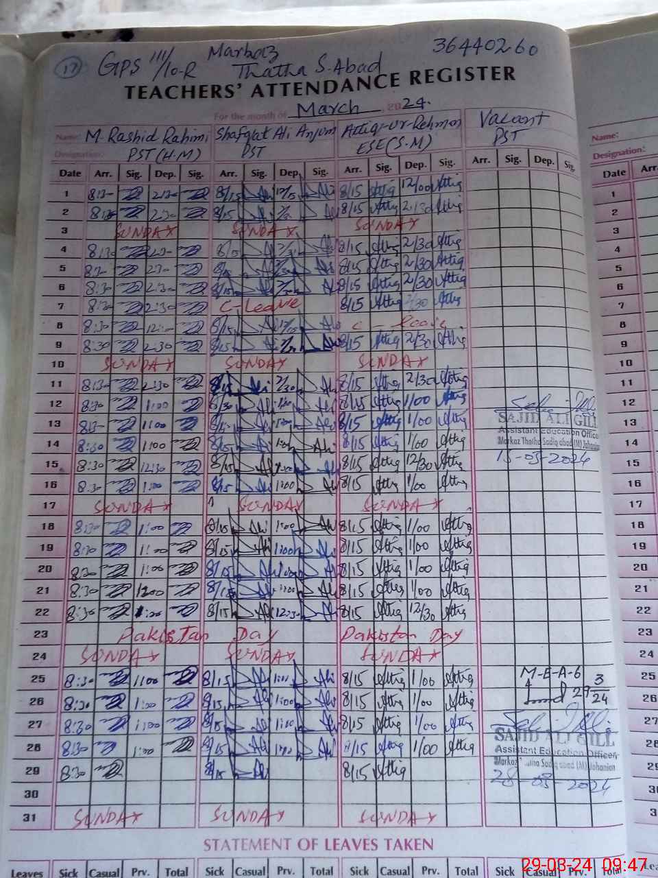 | CNIC | Full Name | Designation | R/C | Absence During Last Calender Month |