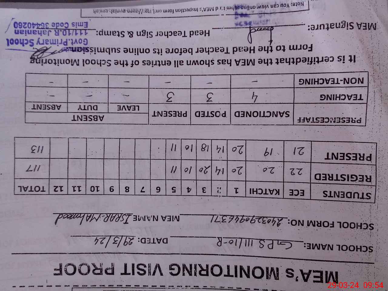 | Attendance Register | Head Teacher | MEA with School | Visit Proof |