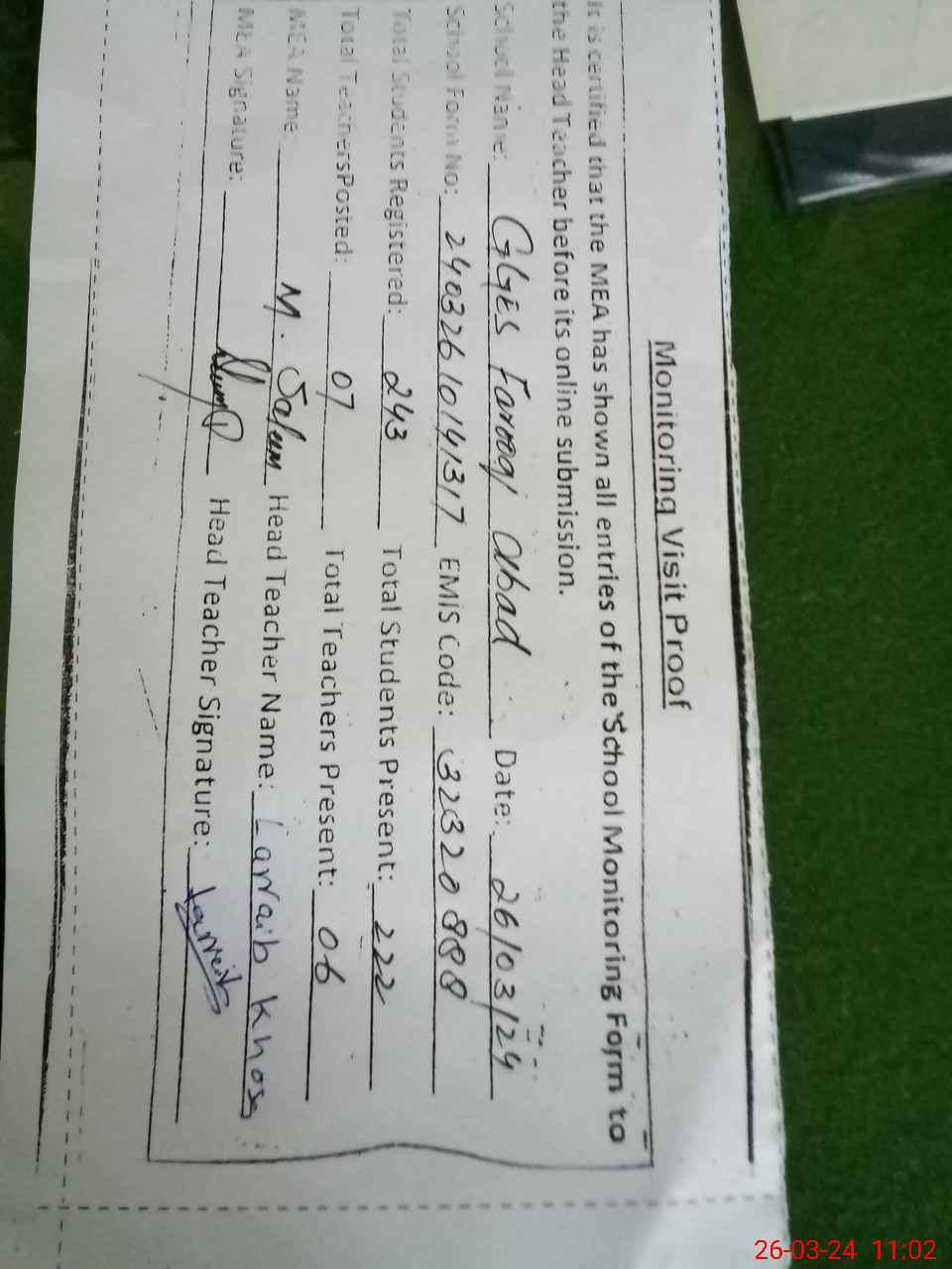 | Attendance Register | Head Teacher | MEA with School | Visit Proof |