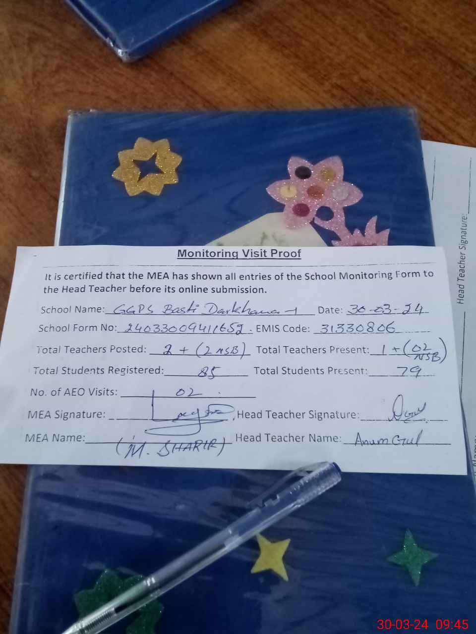 | Attendance Register | Head Teacher | MEA with School | Visit Proof |