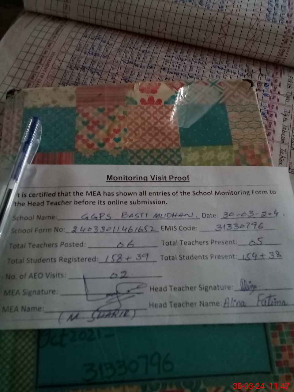 | Attendance Register | Head Teacher | MEA with School | Visit Proof |