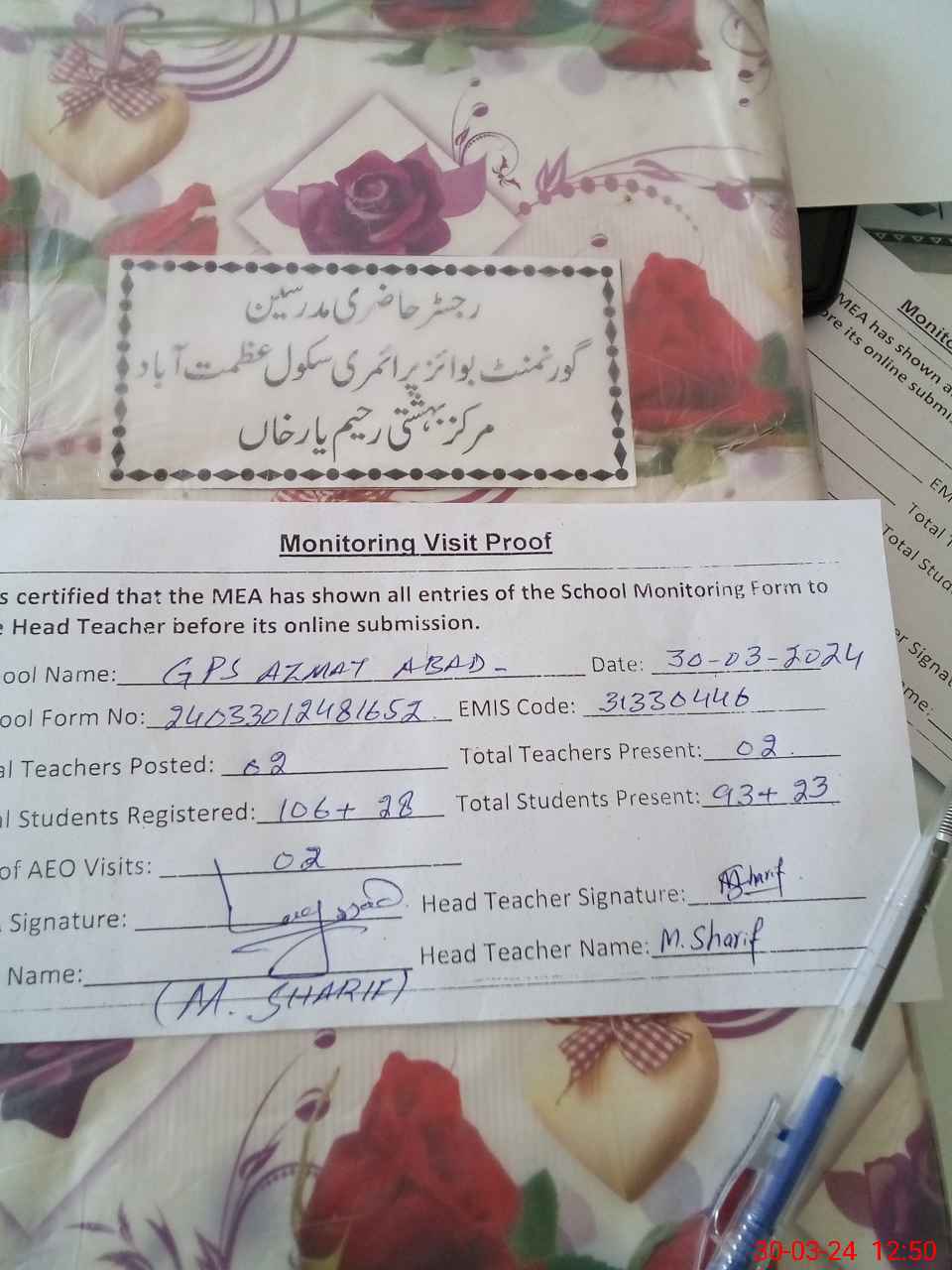 | EMIS Code: 31330446 | Name of School: GPS AZMAT ABAD | |||