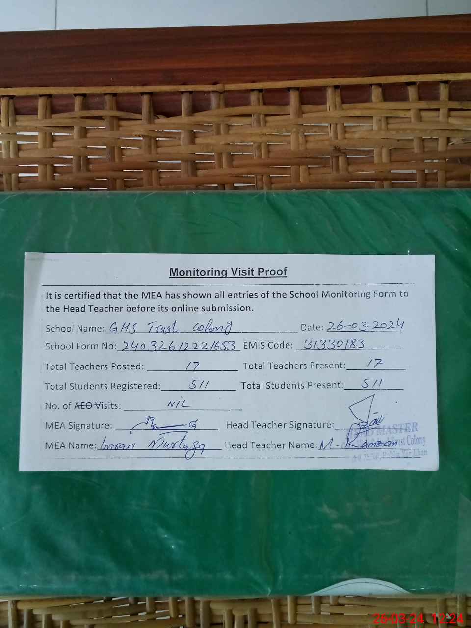 | Attendance Register | Head Teacher | MEA with School | Visit Proof |
