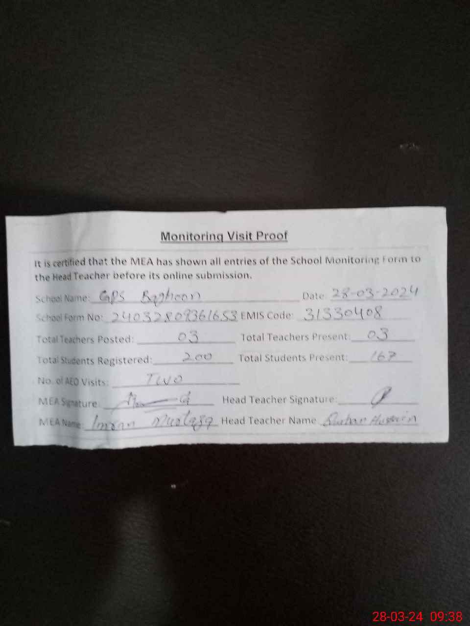 | Attendance Register | Head Teacher | MEA with School | Visit Proof |