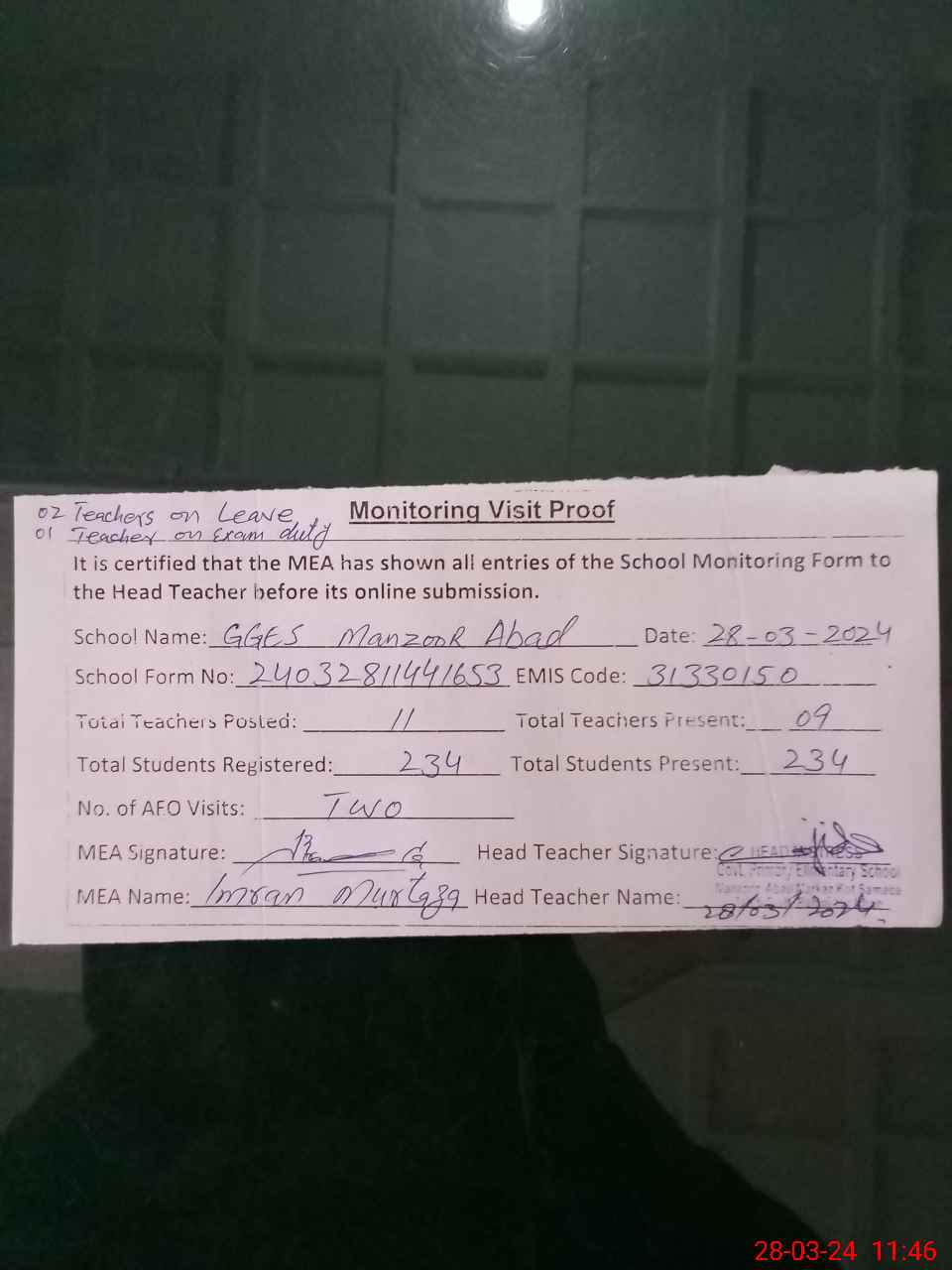 | EMIS Code: 31330150 | Name of School: GGES MANZOOR ABAD | |||