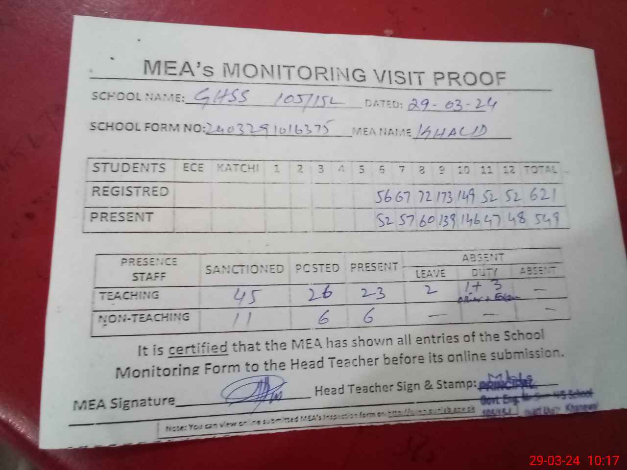 | Attendance Register | Head Teacher | MEA with School | Visit Proof |
