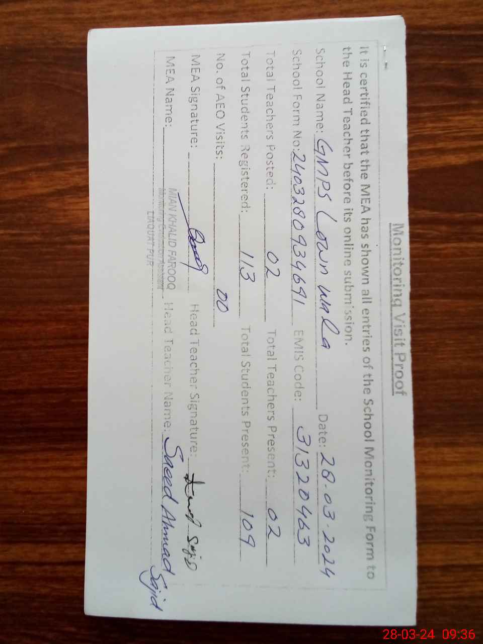 | Attendance Register | Head Teacher | MEA with School | Visit Proof |