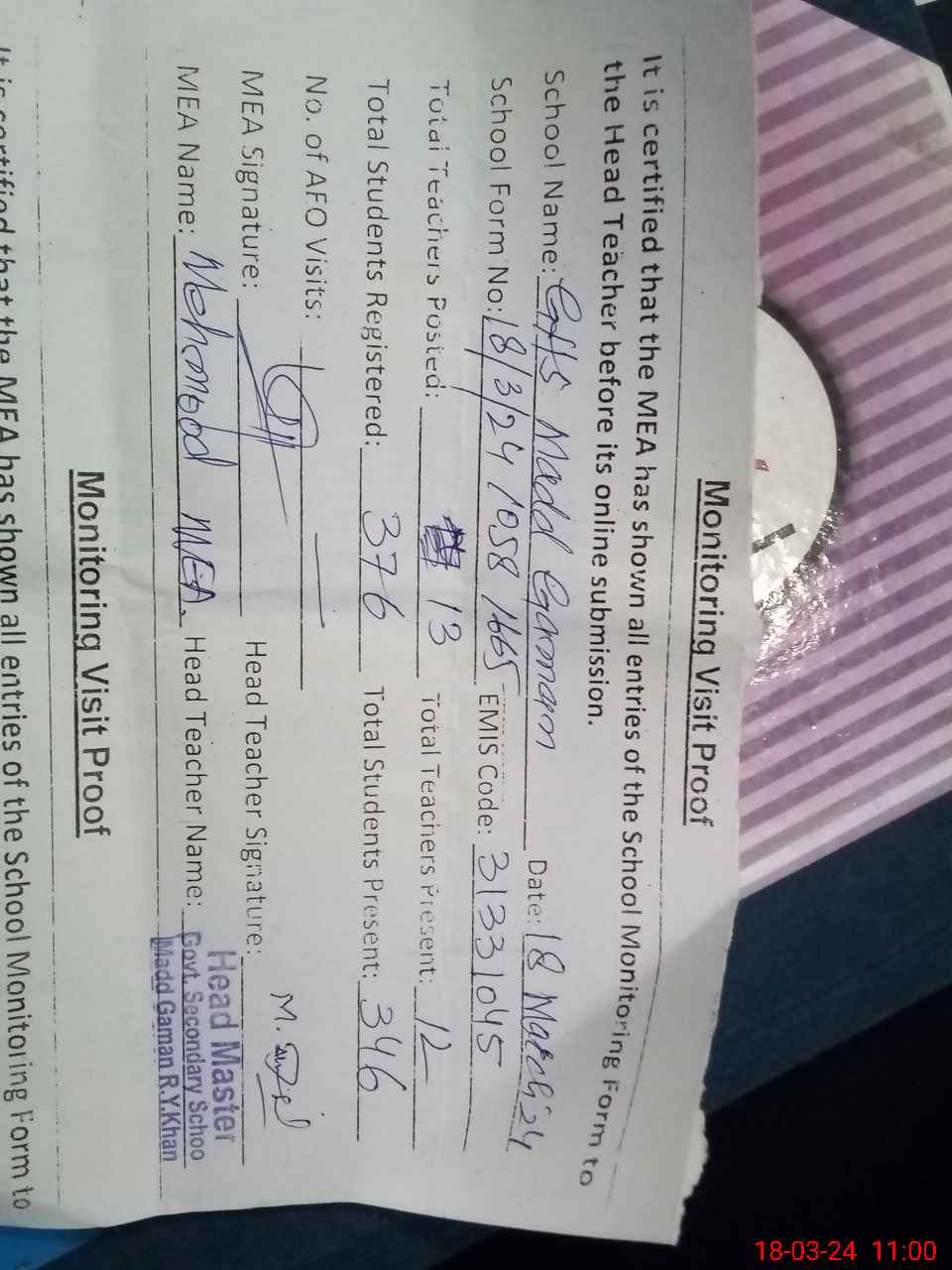 | Attendance Register | Head Teacher | MEA with School | Visit Proof |