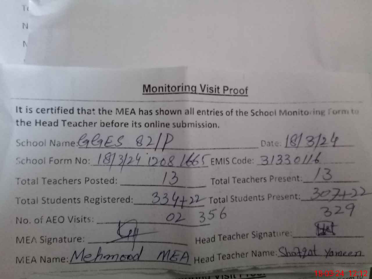 | Attendance Register | Head Teacher | MEA with School | Visit Proof |