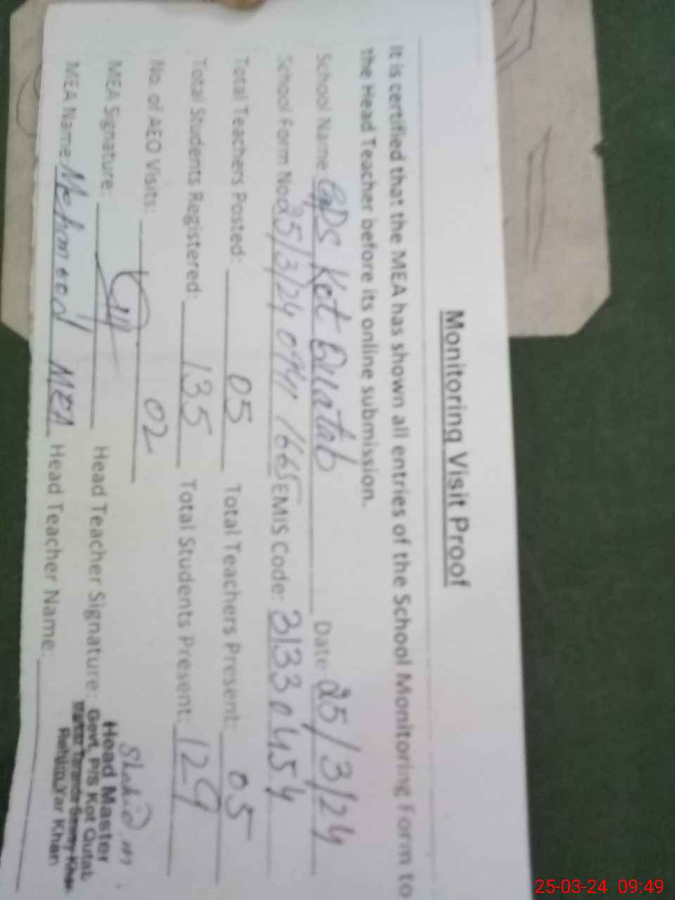 | EMIS Code: 31330454 | Name of School: GPS KOT QUATAB | |||