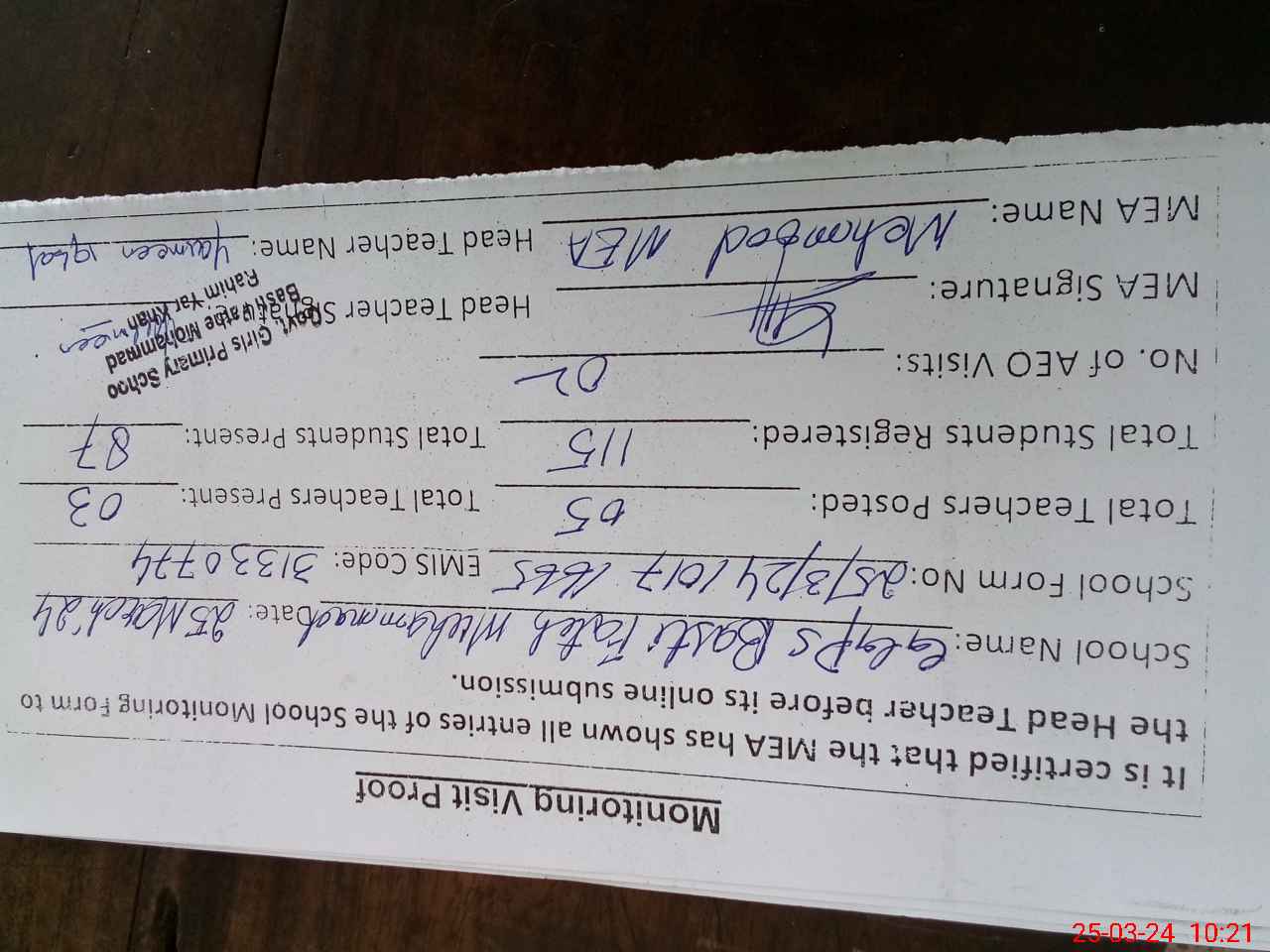 | Monitoring Date: 25-03-2024 | Start Time: 25-03-2024 09:58 AM | End Time: 25-03-2024 10:21 AM | Name of MEA: Ma**** UlHa**** | |