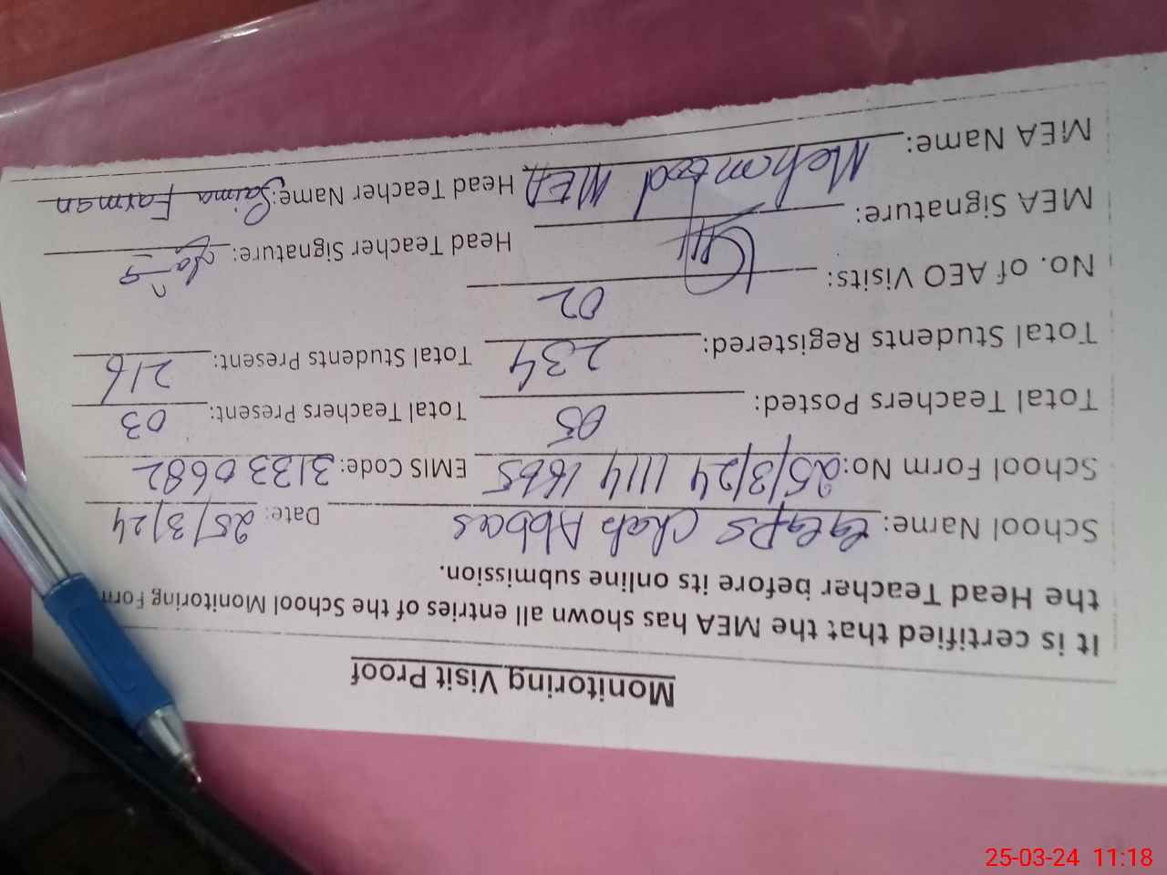 | Certified that this School was Inspected by the Undersigned MEA/DMO Today and the Information Stated Above is as Per Record. | |||||