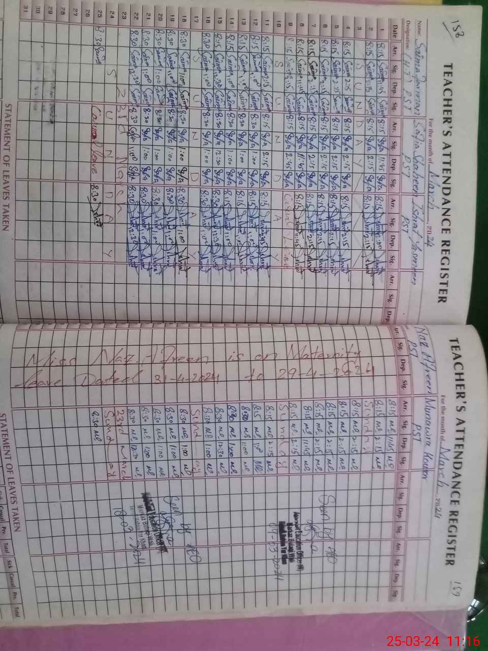 | No. of Students Present - Female | 13 | 0 | 42 | 20 | 23 | 15 | 25 | 21 | 159 | |||||||