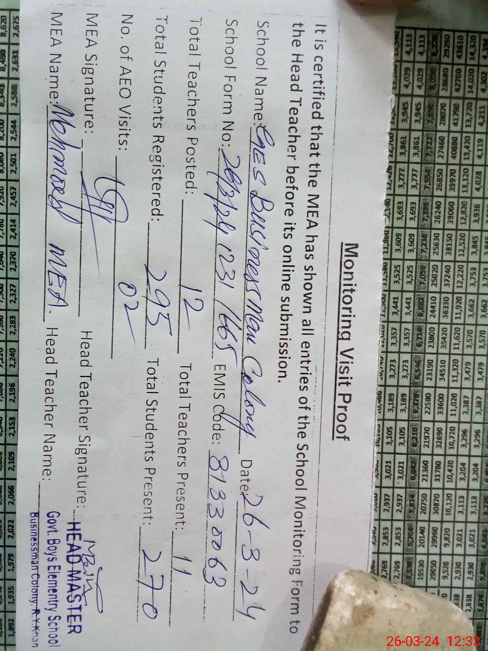 | Certified that this School was Inspected by the Undersigned MEA/DMO Today and the Information Stated Above is as Per Record. | |||||