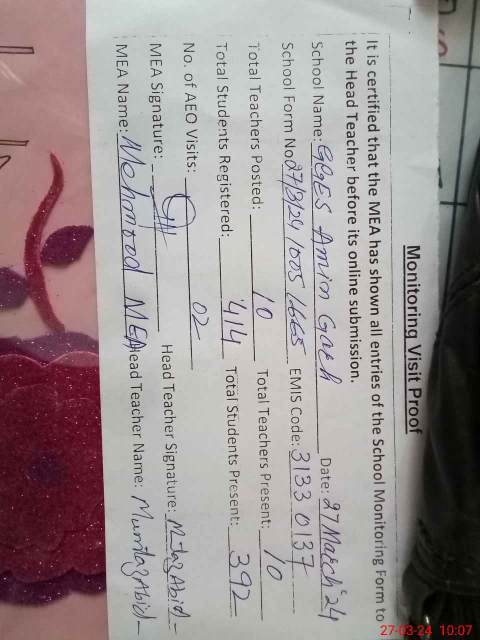 | Attendance Register | Head Teacher | MEA with School | Visit Proof |