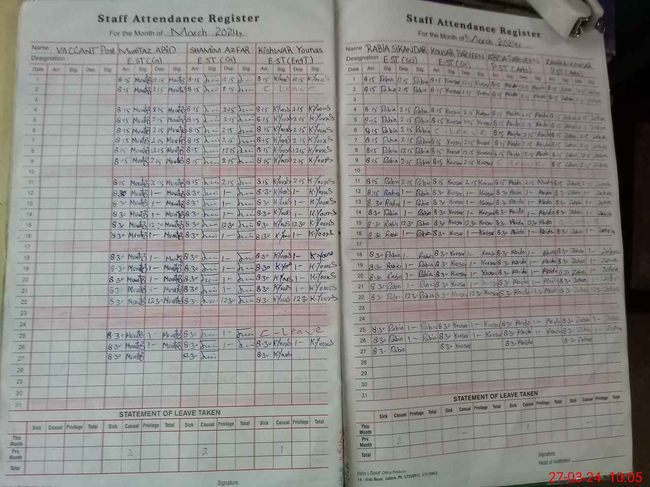 | Monitoring Date: 27-03-2024 | Start Time: 27-03-2024 09:20 AM | End Time: 27-03-2024 10:08 AM | Name of MEA: Ma**** UlHa**** | |