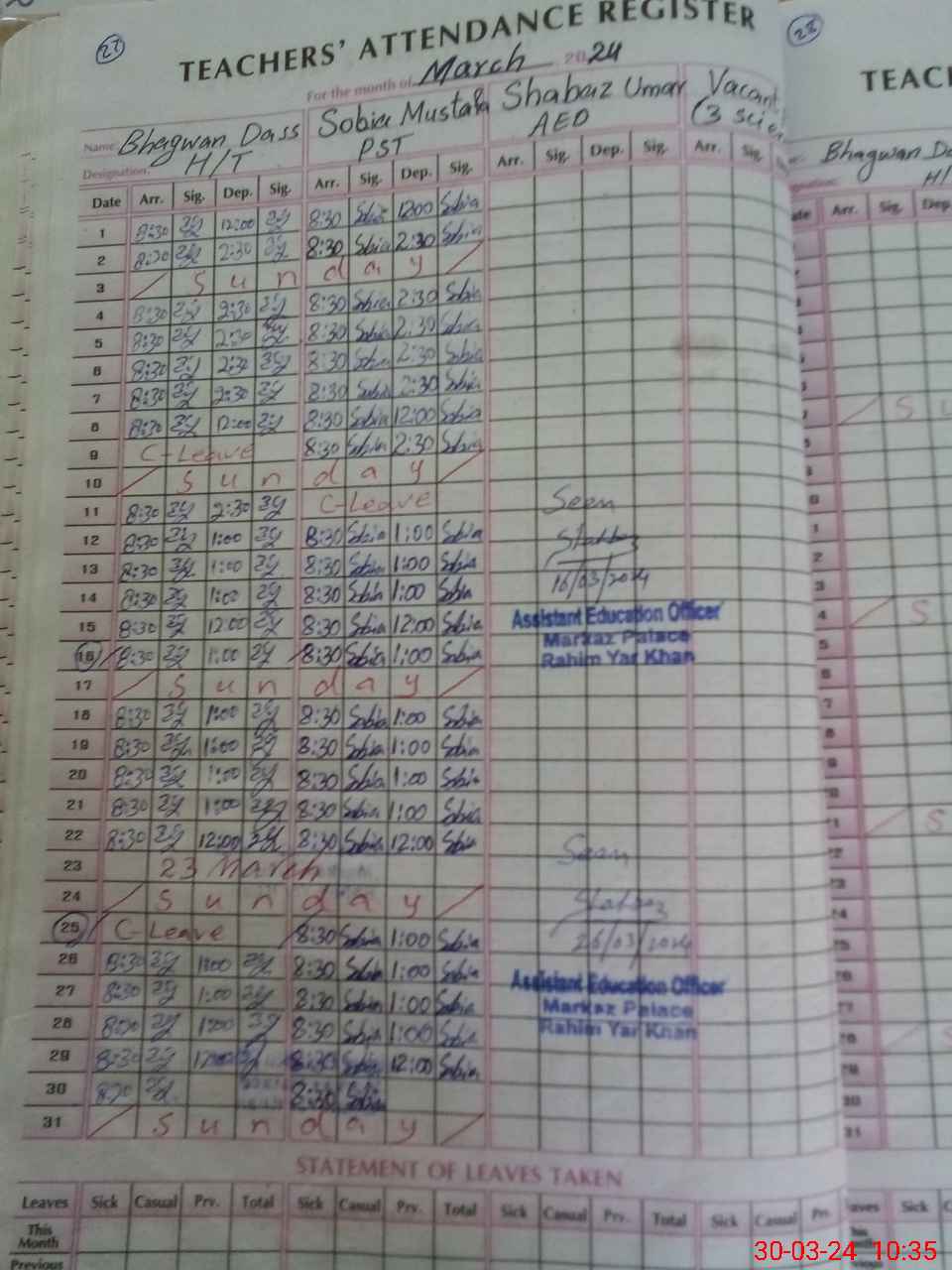 | Leave | Duty | Absent | Maternity | Medical | Ex- Pak |