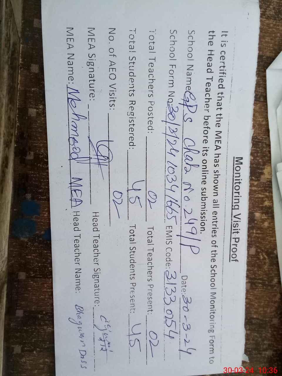 | Attendance Register | Head Teacher | MEA with School | Visit Proof |