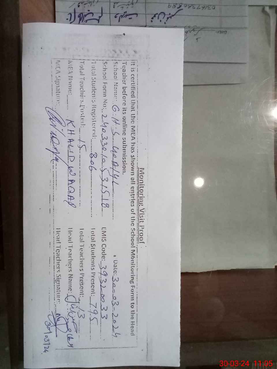 | Attendance Register | Head Teacher | MEA with School | Visit Proof |