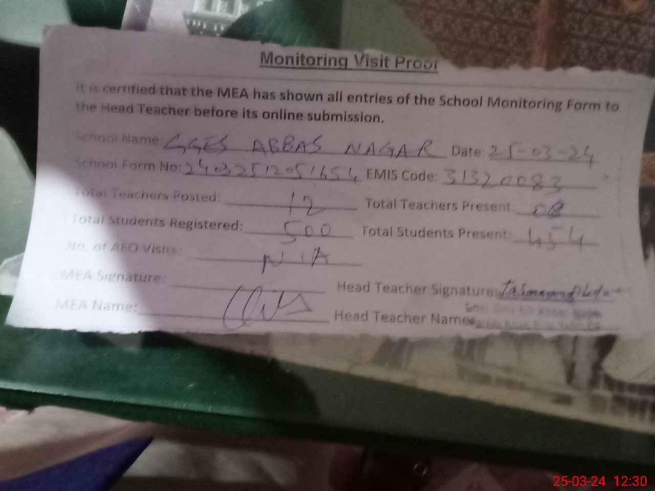 | Attendance Register | Head Teacher | MEA with School | Visit Proof |