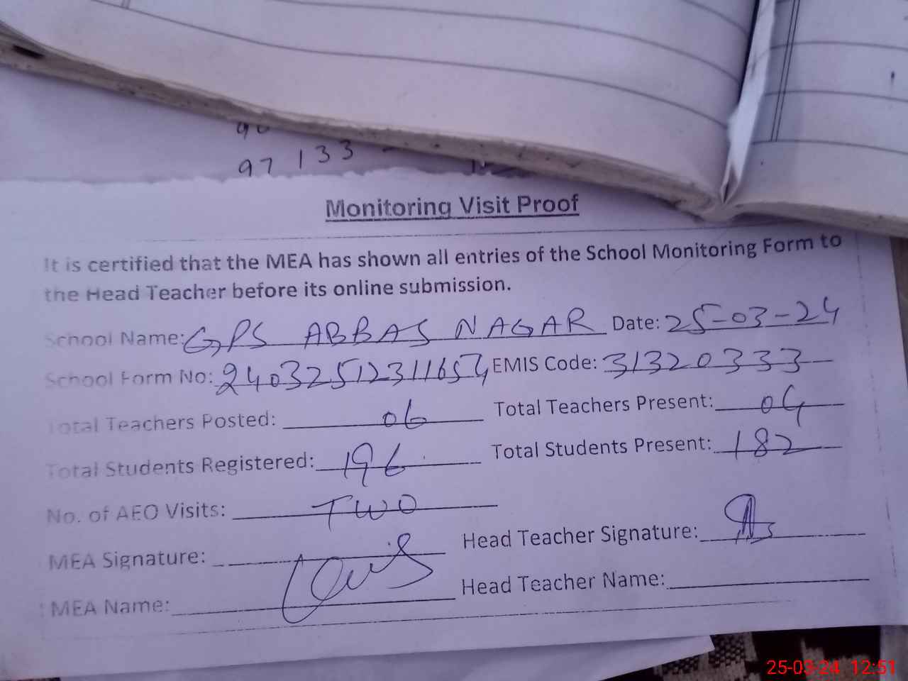 | Attendance Register | Head Teacher | MEA with School | Visit Proof |
