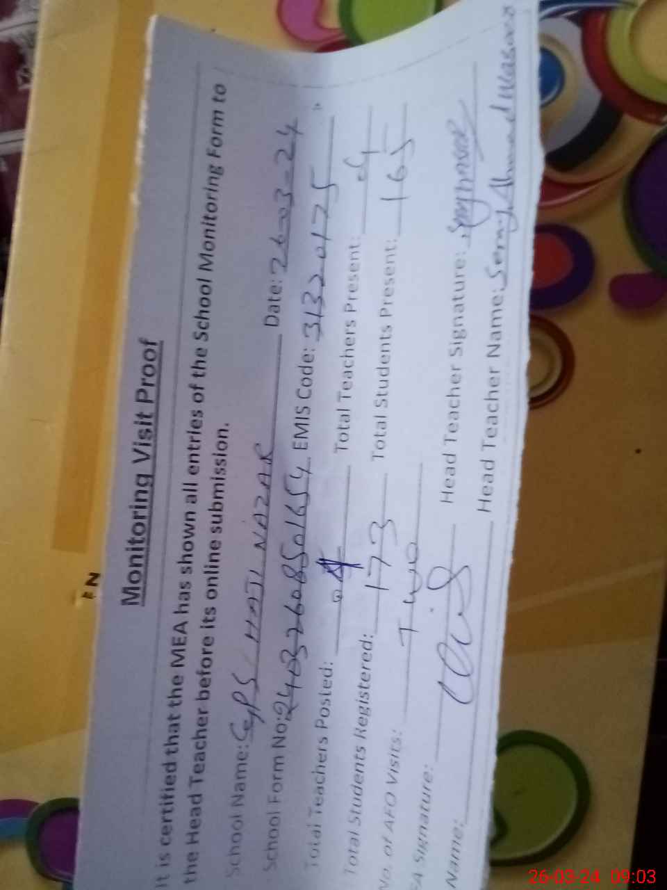 | Attendance Register | Head Teacher | MEA with School | Visit Proof |