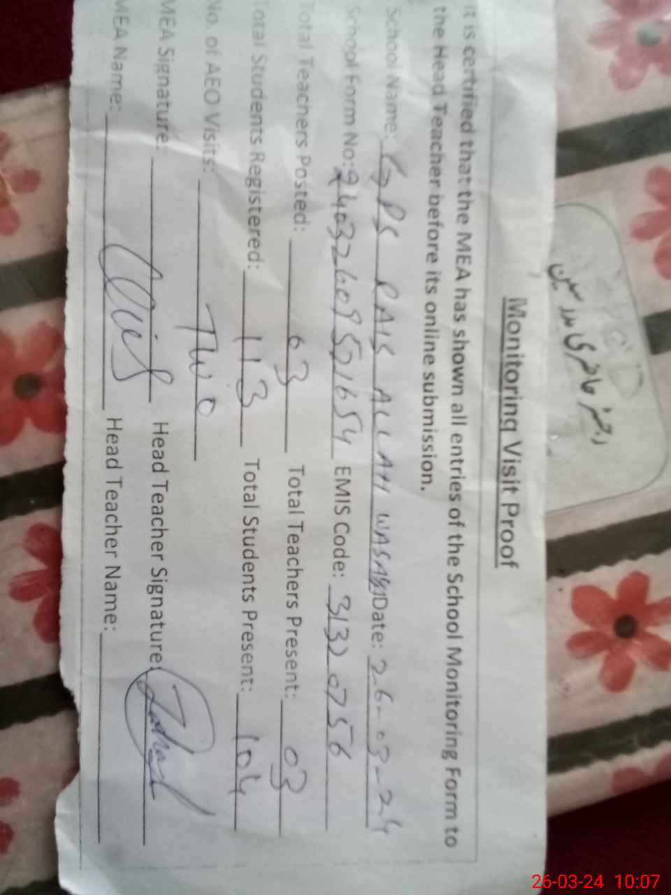 | Attendance Register | Head Teacher | MEA with School | Visit Proof |