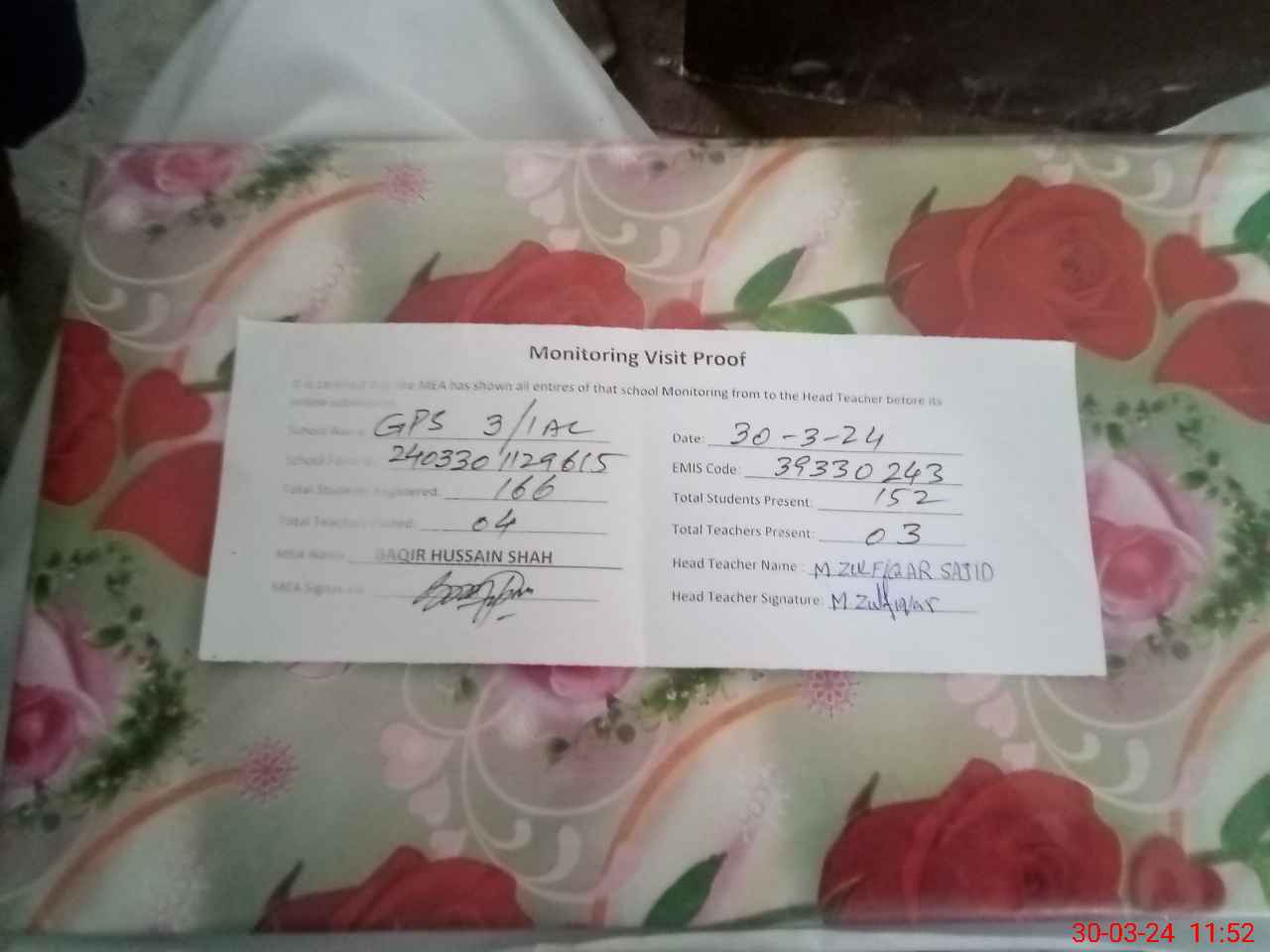 | Attendance Register | Head Teacher | MEA with School | Visit Proof |