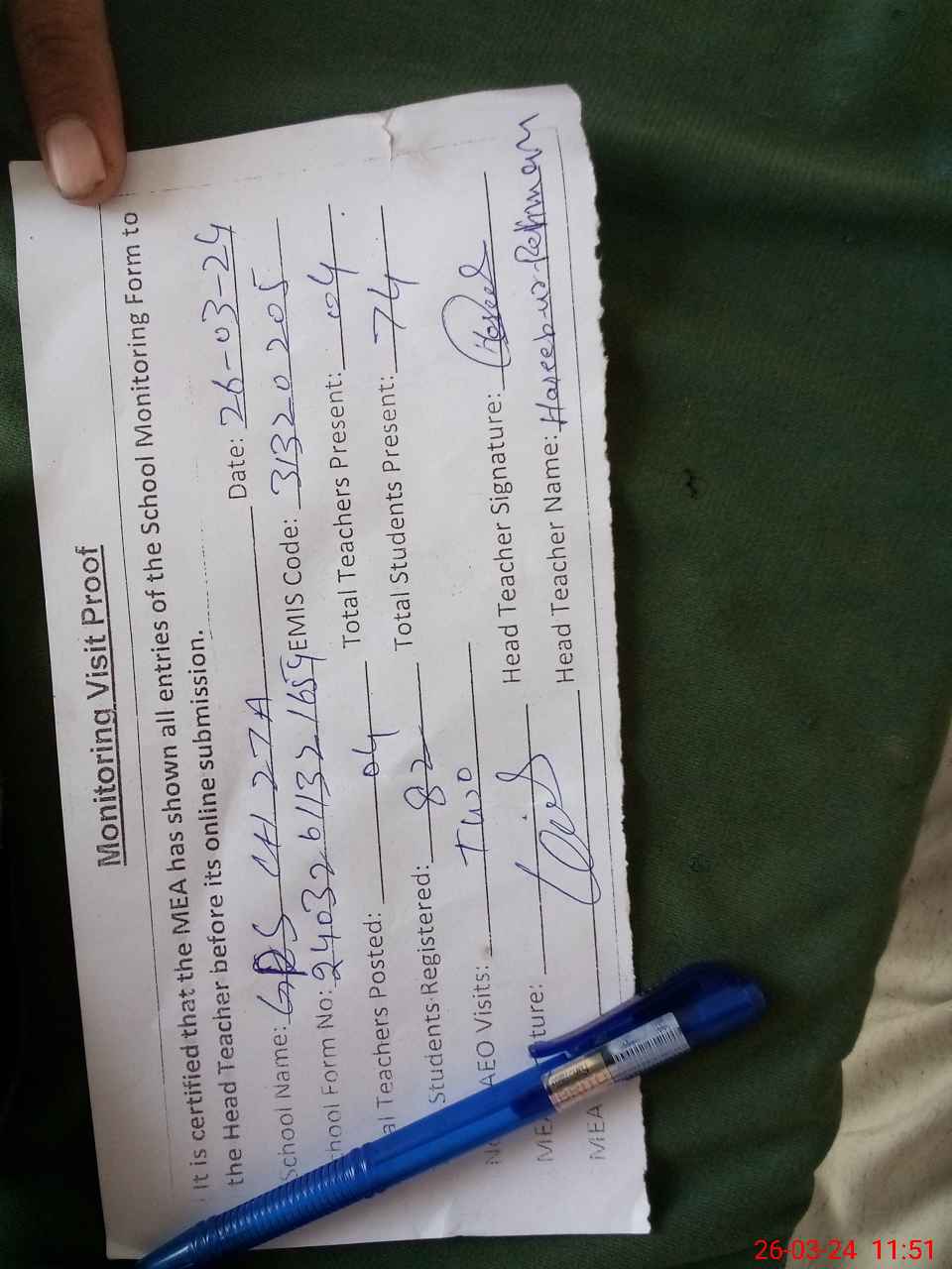 | Attendance Register | Head Teacher | MEA with School | Visit Proof |