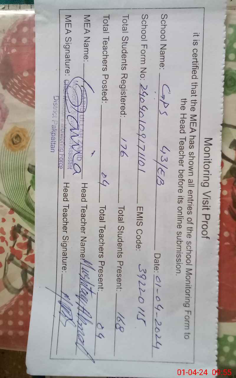 | Certified that this School was Inspected by the Undersigned MEA/DMO Today and the Information Stated Above is as Per Record. | |||||