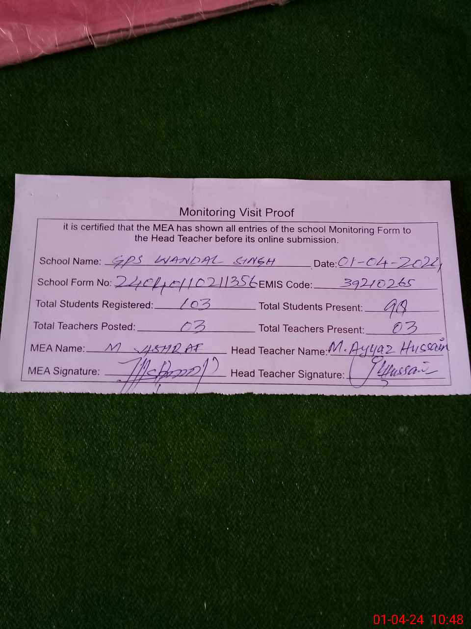| EMIS Code: 39210265 | Name of School: GPS WANDAL SINGH | |||