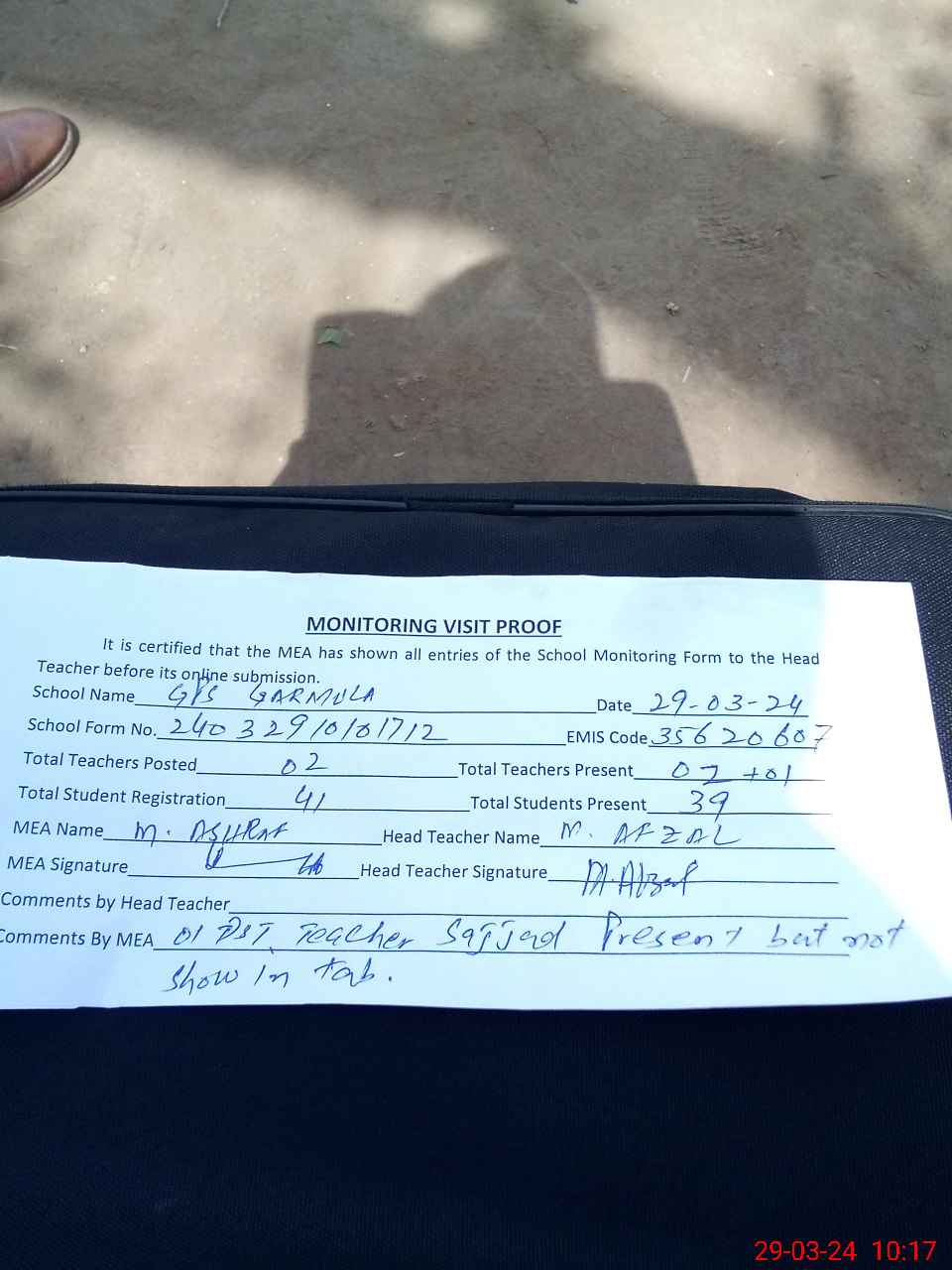 | EMIS Code: 35620607 | Name of School: GPS GARMULA CHAK 169/RB | |||