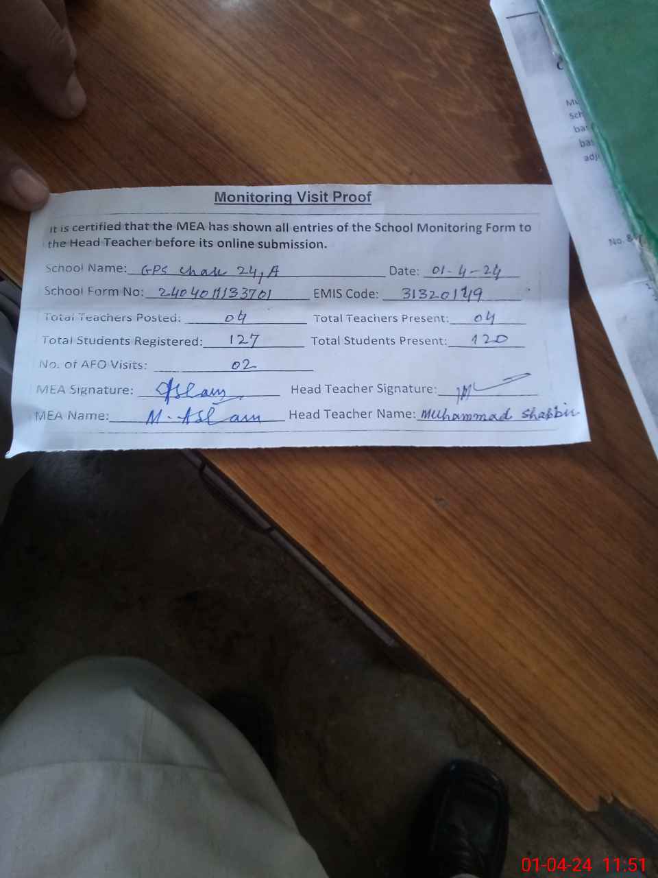| Attendance Register | Head Teacher | MEA with School | Visit Proof |