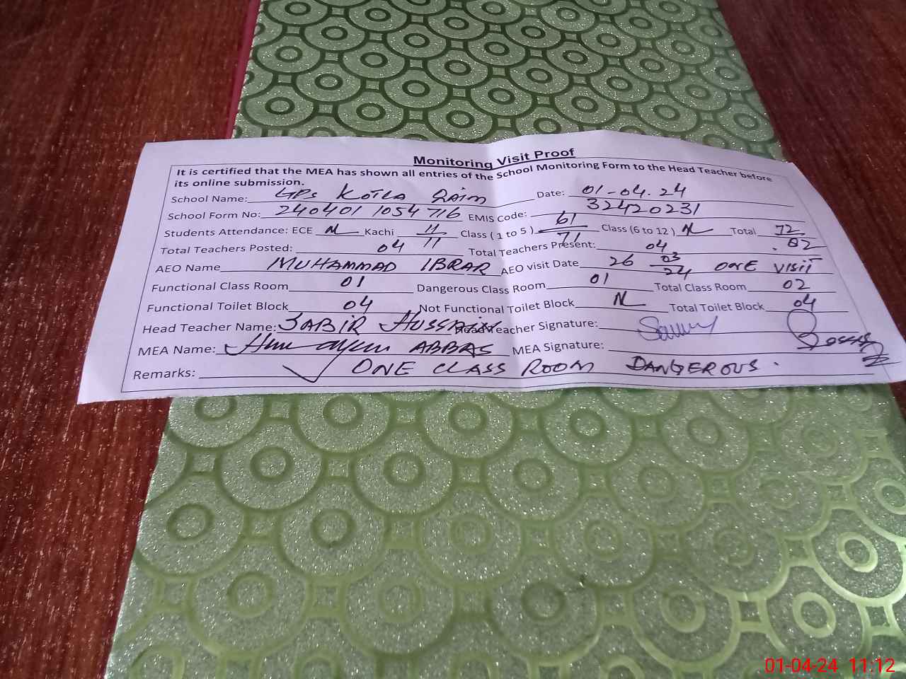 | EMIS Code: 32420231 | Name of School: GPS KOTLA QAIM | |||