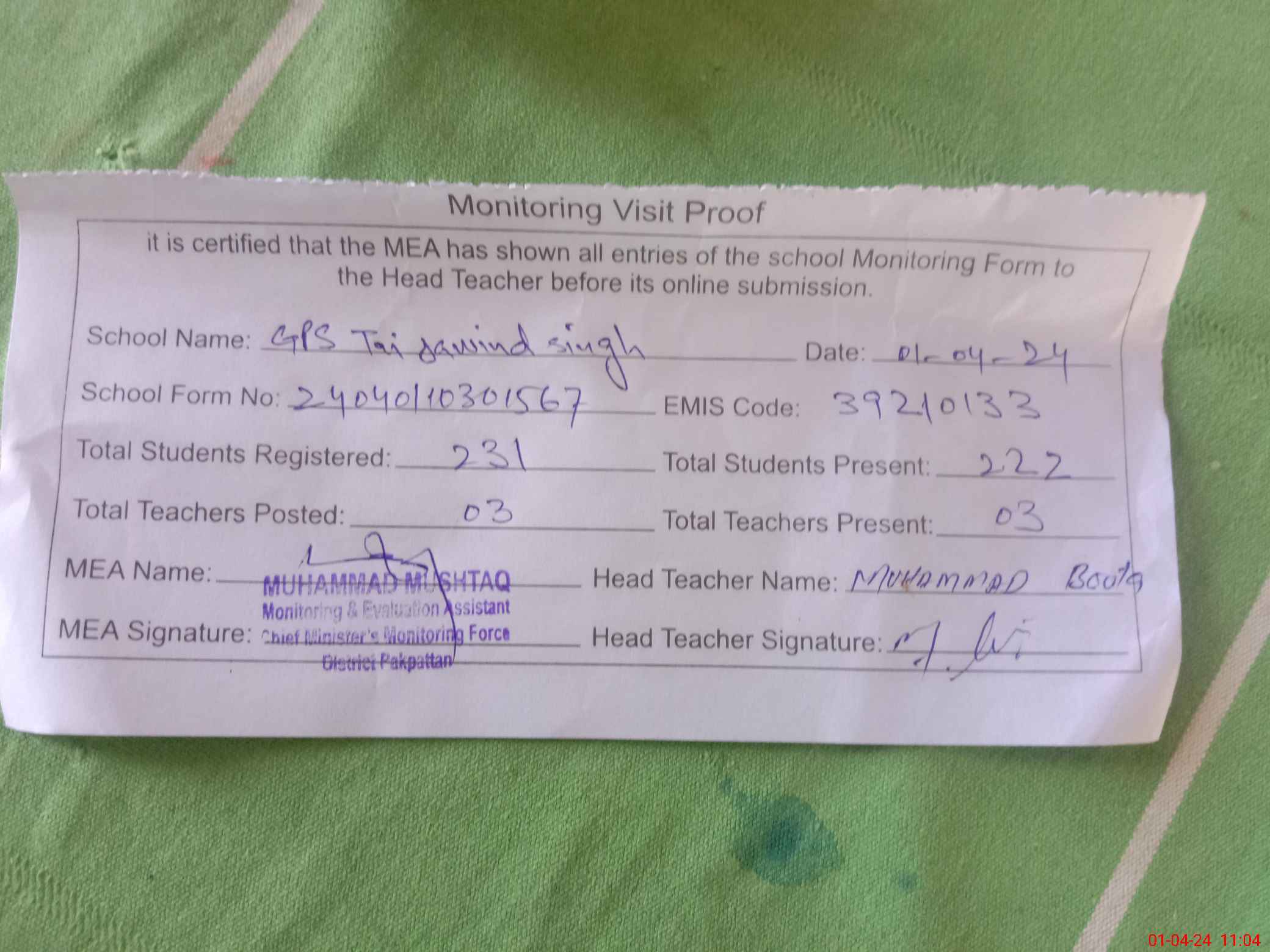 | EMIS Code: 39210133 | Name of School: GPS TAI JAWIND SINGH | |||