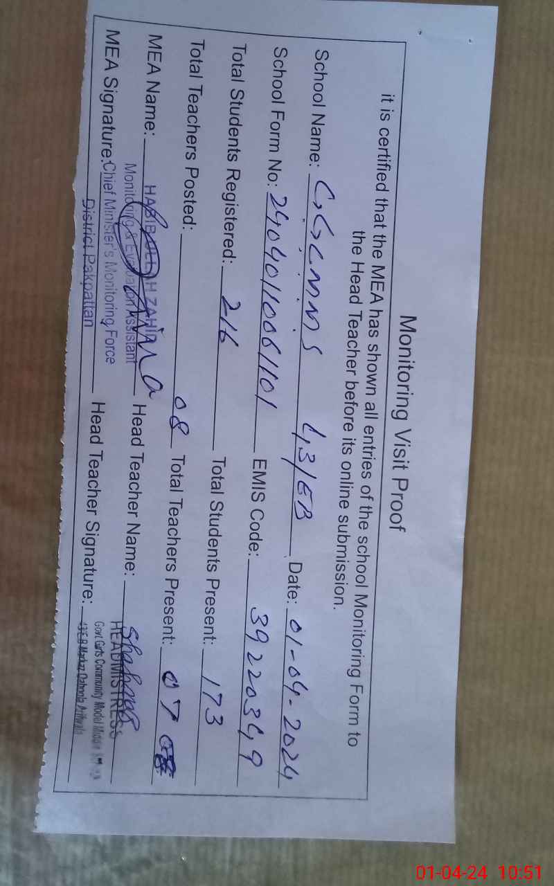 | EMIS Code: 39220349 | Name of School: GGCMES 43 EB P/O KOT KHUDA BUKHSH | |||