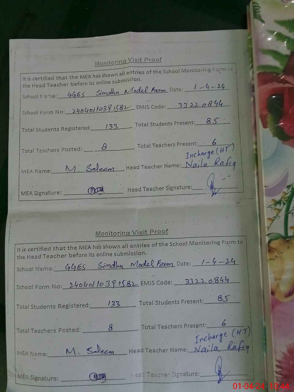 | Attendance Register | Head Teacher | MEA with School | Visit Proof |