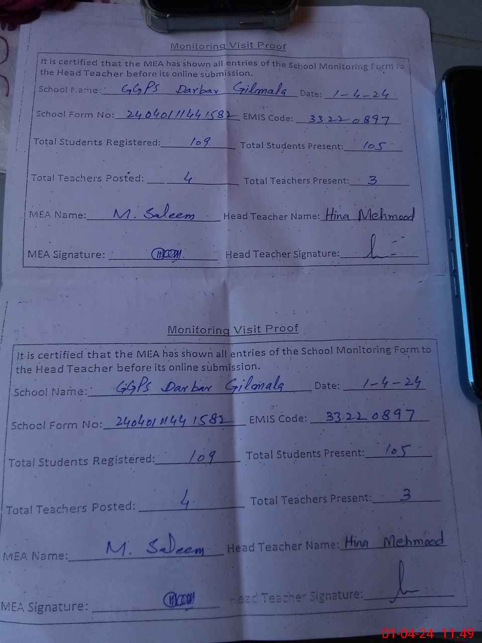 | Attendance Register | Head Teacher | MEA with School | Visit Proof |