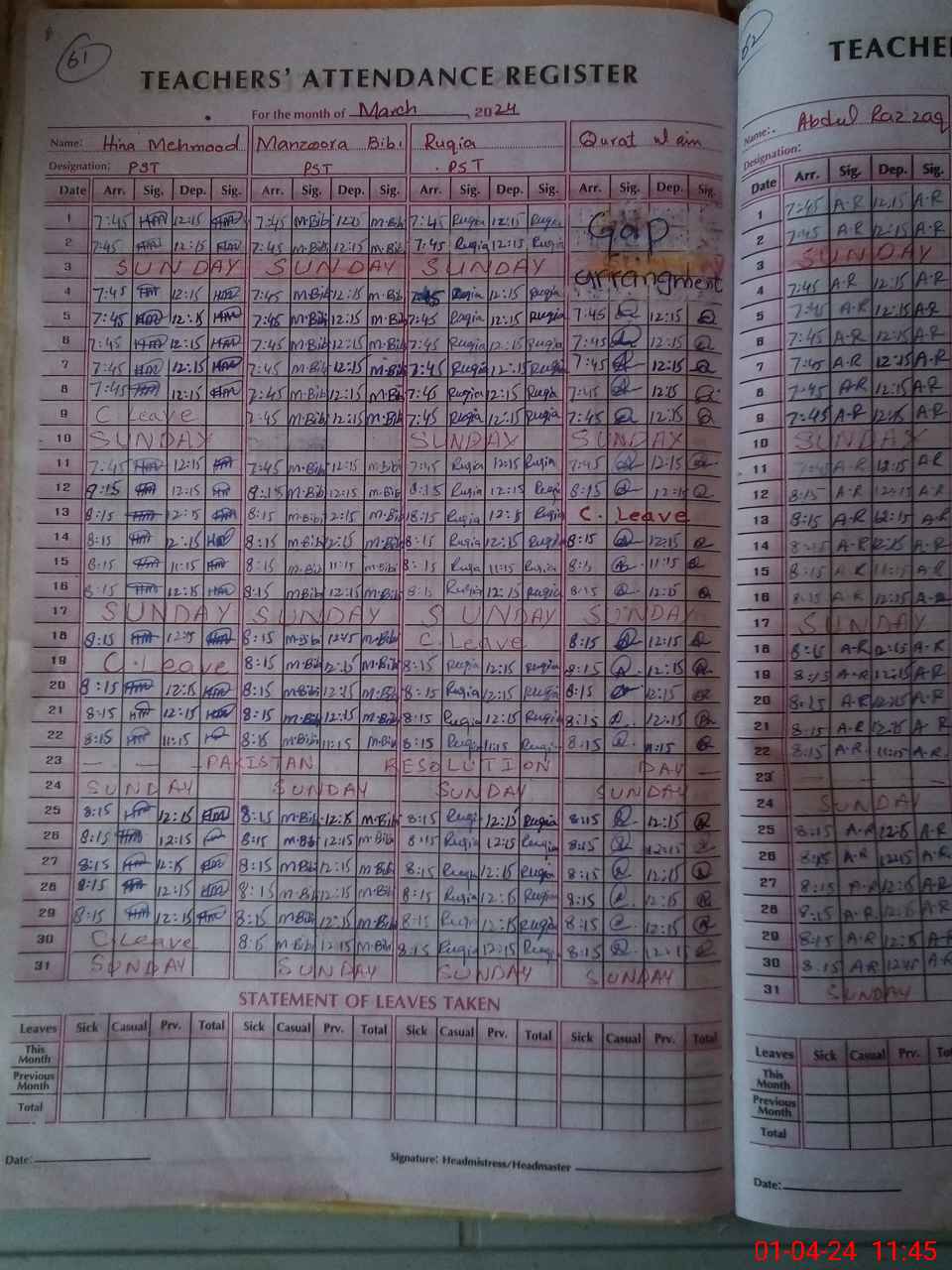 | Leave | Duty | Absent | Maternity | Medical | Ex- Pak |