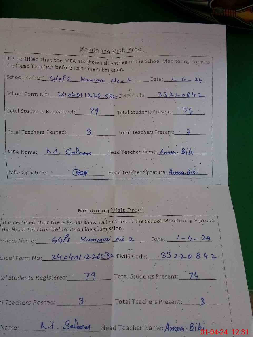 | Attendance Register | Head Teacher | MEA with School | Visit Proof |