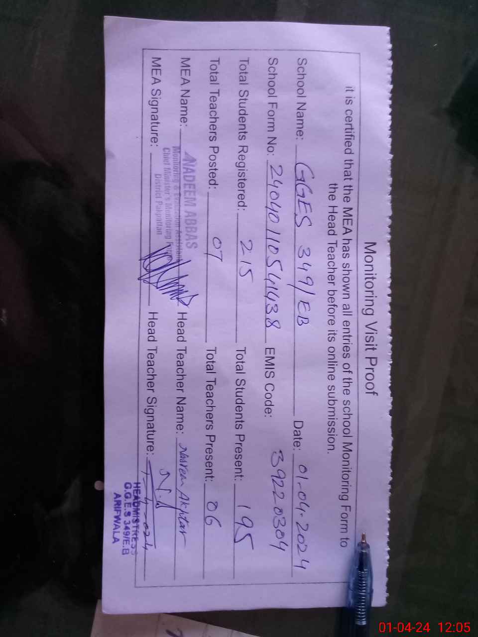 | EMIS Code: 39220304 | Name of School: GGES 349 EB POST OFFICE chak 157/EB | |||