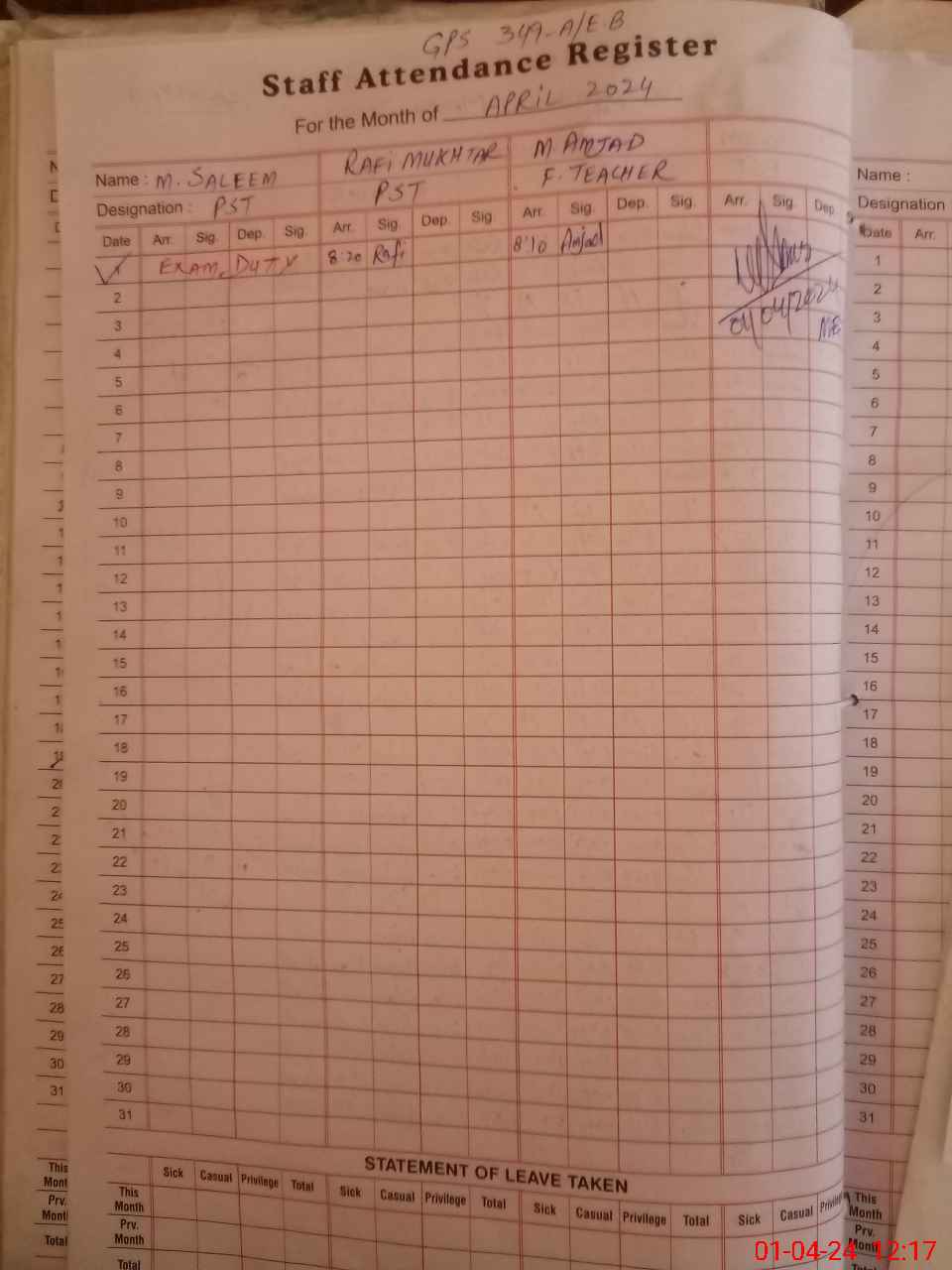 | 36**** | MSa**** | PST | Regular | 1 | 3 | 0 | 0 | 0 | 0 | 0 | 0 | 1 | Exam Duty |