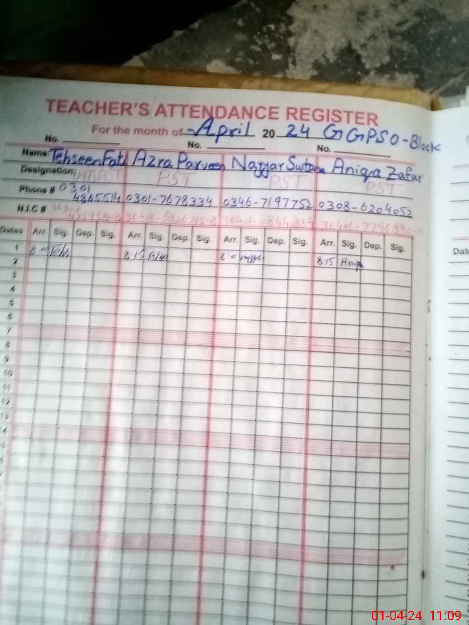 | Name: AZ**** PA**** Designation: (School Headmaster's/Headmistress's) PST Phone/Cell Number: 03**** |