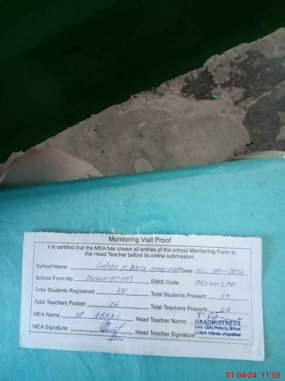 | Attendance Register | Head Teacher | MEA with School | Visit Proof |