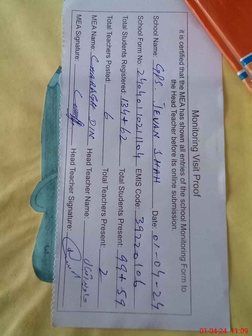 | Attendance Register | Head Teacher | MEA with School | Visit Proof |