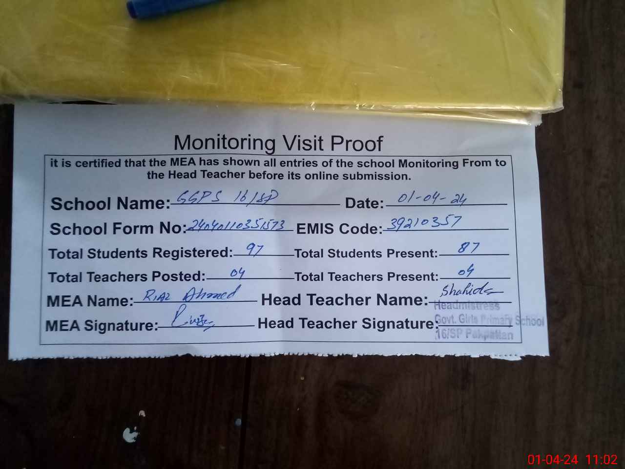 | Attendance Register | Head Teacher | MEA with School | Visit Proof |