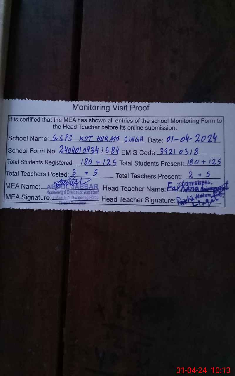 | EMIS Code: 39210318 | Name of School: GGPS KOT HUKAM SINGH | |||