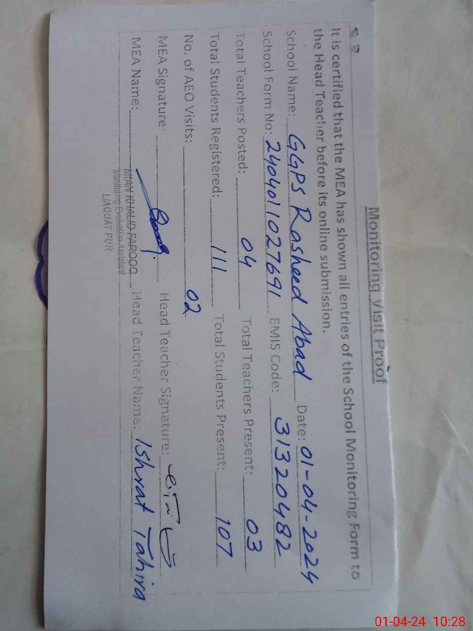 | EMIS Code: 31320482 | Name of School: GGPS RASHEED ABAD | |||