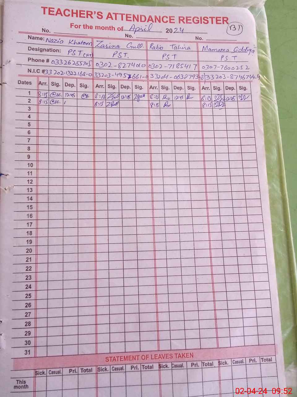 | Name: NA**** KH**** Designation: (School Headmaster's/Headmistress's) PST Phone/Cell Number: 03**** |