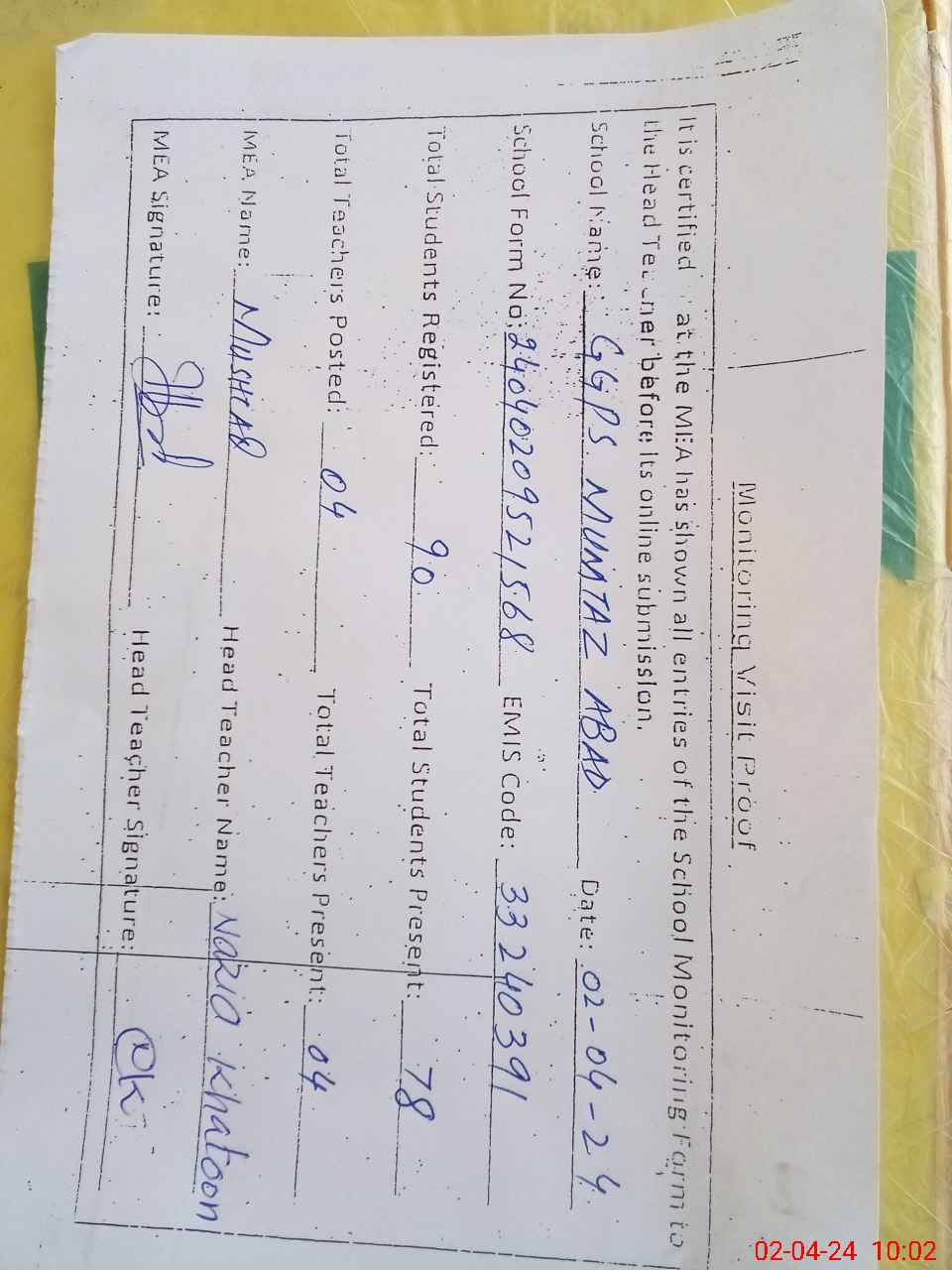 | EMIS Code: 33240391 | Name of School: GGPS MUMTAZ ABAD | |||